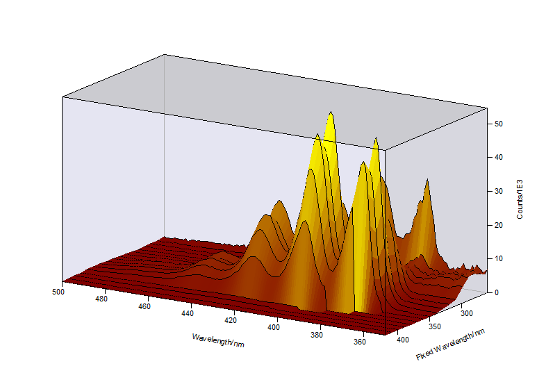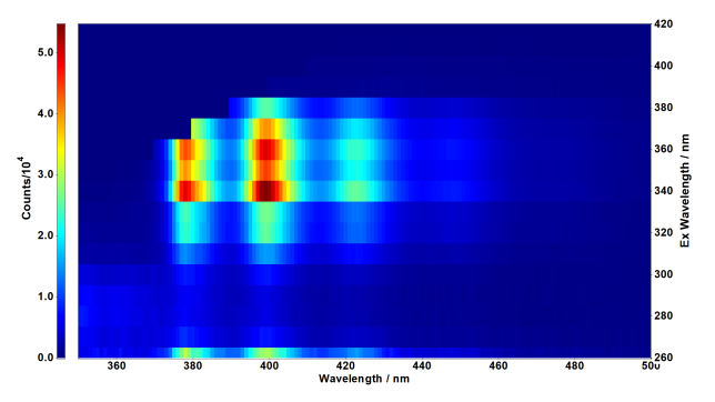 三维荧光光谱(Excitation-Emission-Matrix Spectra, 简称EEMs)也称为激发-发射矩阵光谱,可快速同步扫描激发波长和发射波长,获取样品的荧光强度 。区别于激发/发射光谱等二维荧光光谱,三维荧光光谱能同时扫描并改变激发和发射波长,同步记录的荧光强度变化关系为二元函数,能更为全面、准确地表征待测物质的荧光特性。