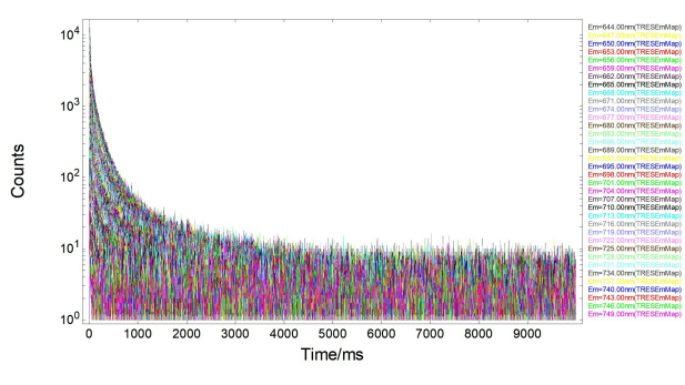 时间分辨瞬态荧光光谱(Time-Resolved EmissionSpectroscopy,TRES)是一种研究分子激发态衰变过程及其规律的光谱技术,具有高灵敏度、高分辨率和高时间分辨率等优点,可以用于研究分子激发态的能级结构、能量转移和动力学过程。主要通过探测荧光寿命衰减曲线来获取分子激发态的寿命信息,以及通过测量不同延迟时间的荧光光谱来获取激发态的能量转移和动力学信息。