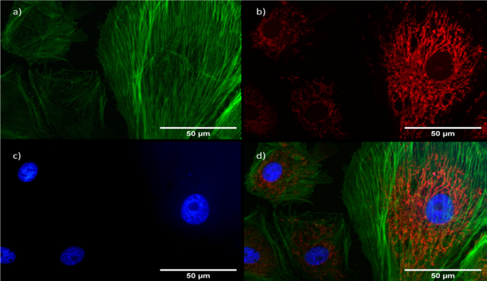 图11 a-c分别为Alexa Fluor®488标记的丝状肌动蛋白、MitoTracker®Red CMXRos标记的线粒体和DAPI标记的细胞核的单独宽场荧光图像。然后将这些单独的图像进行组合,形成如图d所示的复合图像,显示出完整的细胞结构