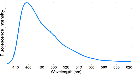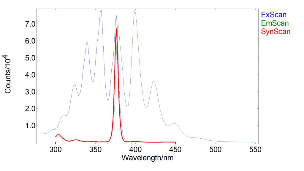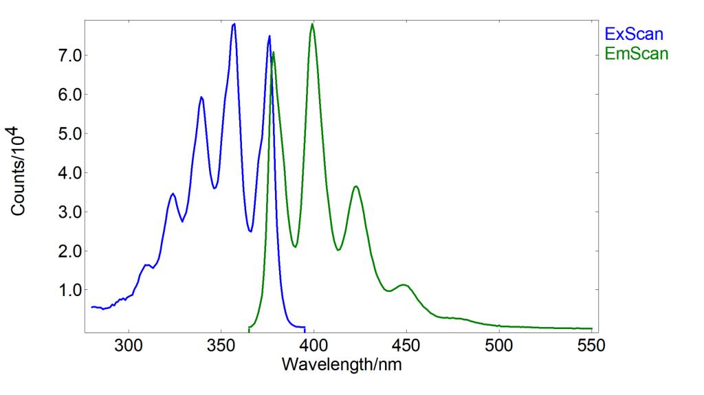 图1.蒽的激发光谱(蓝色)和发射光谱(绿色)