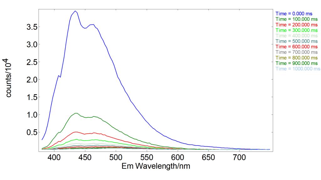 瞬态荧光光谱主要研究物质在脉冲光源照射后,荧光信号/强度随时间的变化,一般检测的荧光信号/强度(y)是时间(x)的函数。