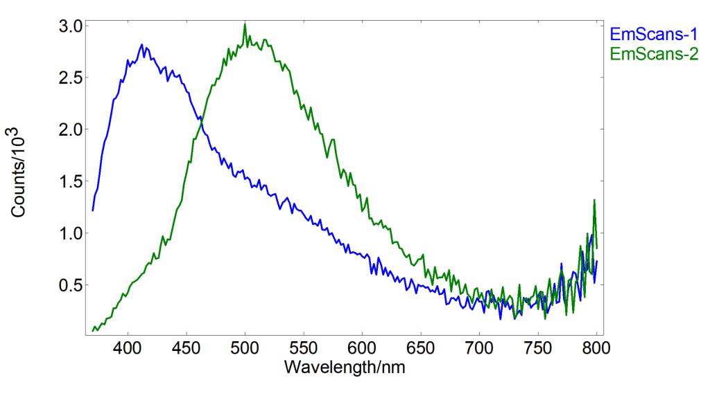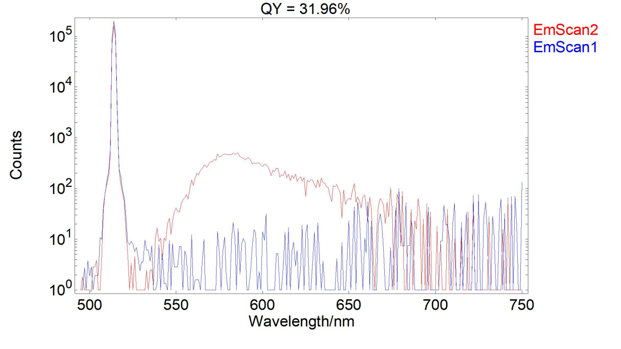 (如图所示,EmScan1为参比样,EmScan2为样品,通过发射光子(红色区域)和吸收光子数(蓝色区域)的比值,计算出量子产率。)