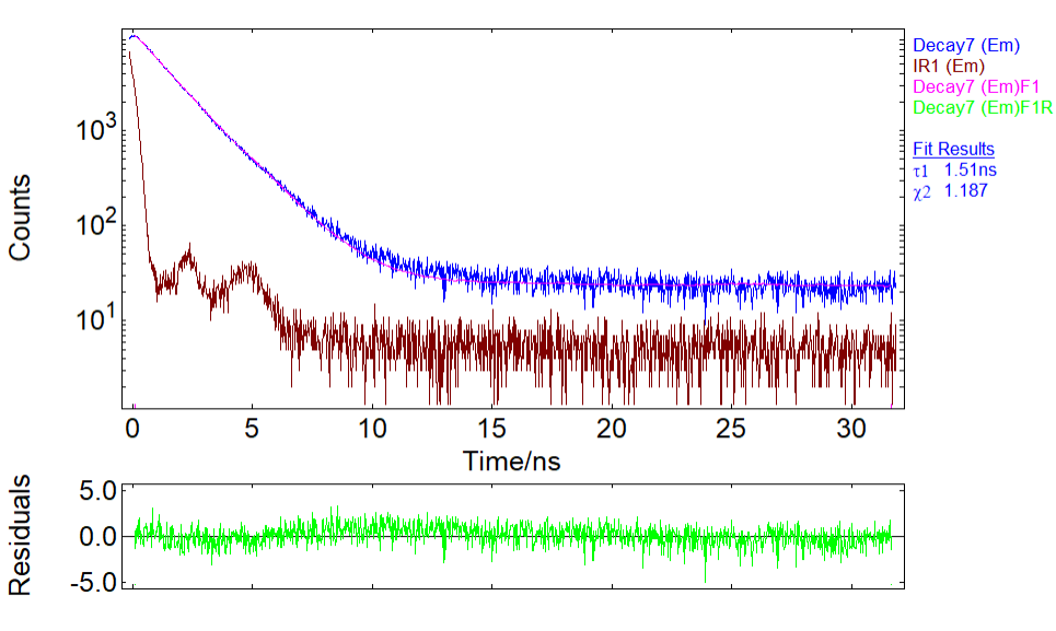 图6.罗丹明B荧光寿命(蓝色为罗丹明B寿命数据,红色为仪器响应函数)